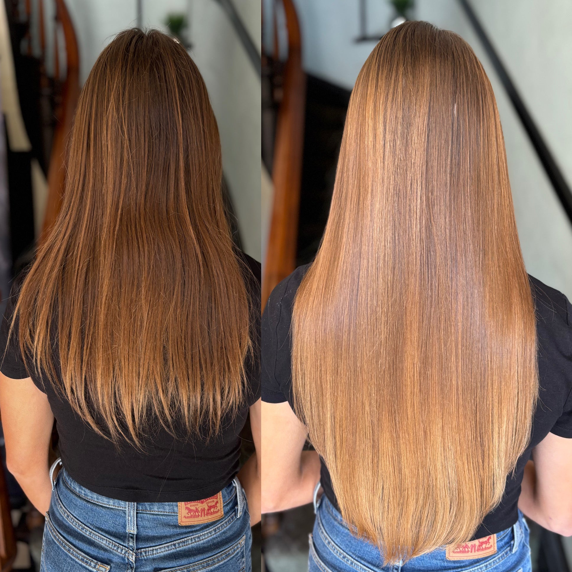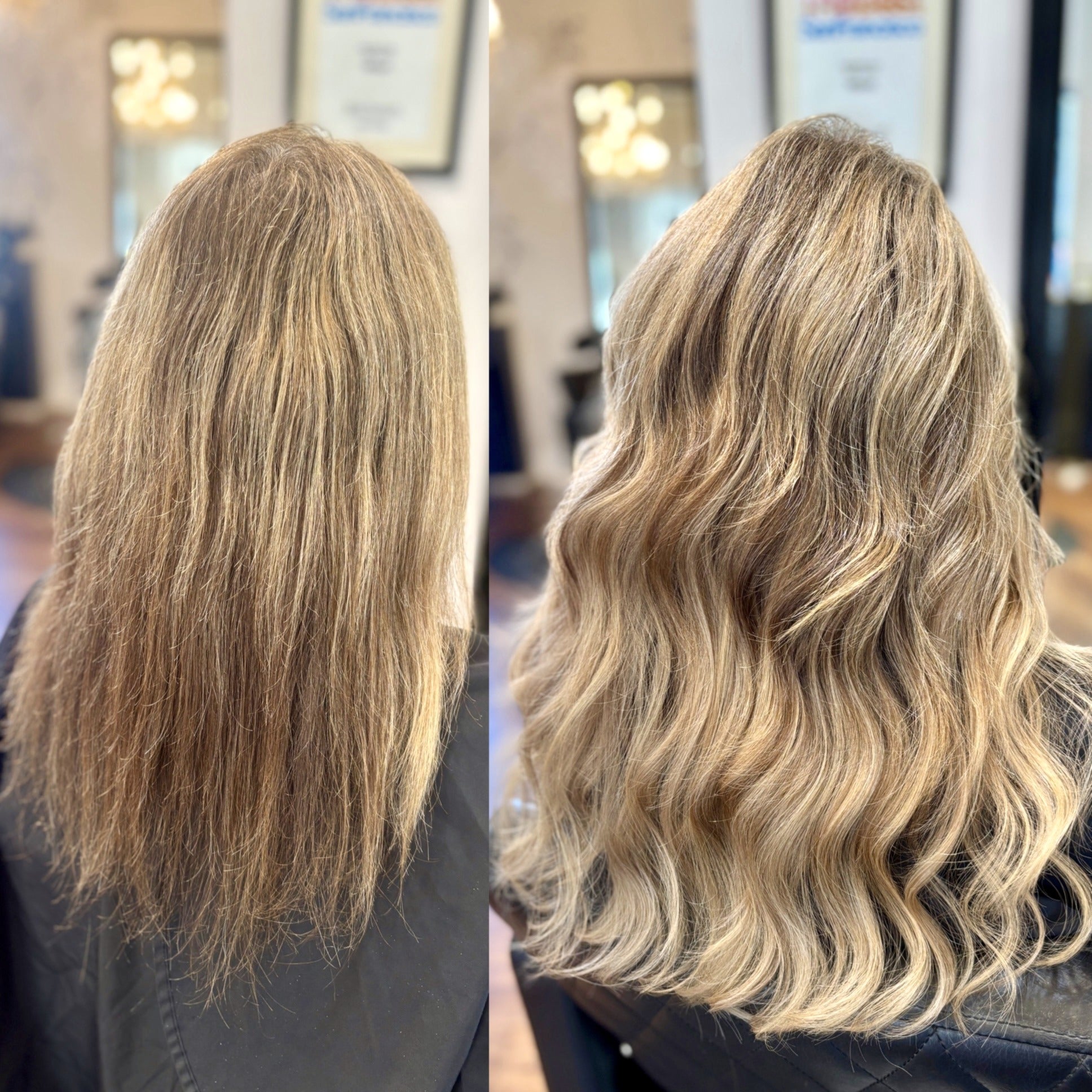 Our Luxe, European grade hair is 100% Remy Indian human hair that is hand selected and is 70% double drawn where 70% of the short hairs are removed giving the ends a fuller look.